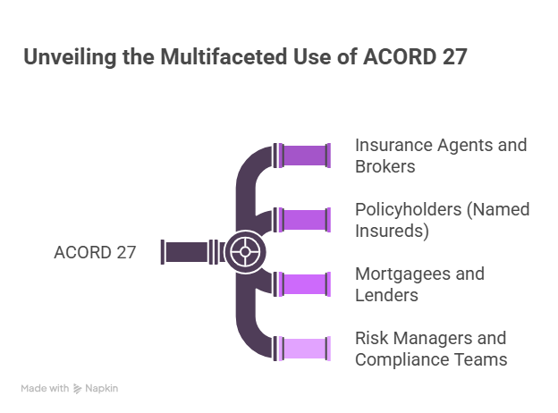 Risk managers and compliance teams use ACORD 27 documentation to track insurance requirements across large real estate portfolios, ensuring every property meets lender and regulatory standards at all times.