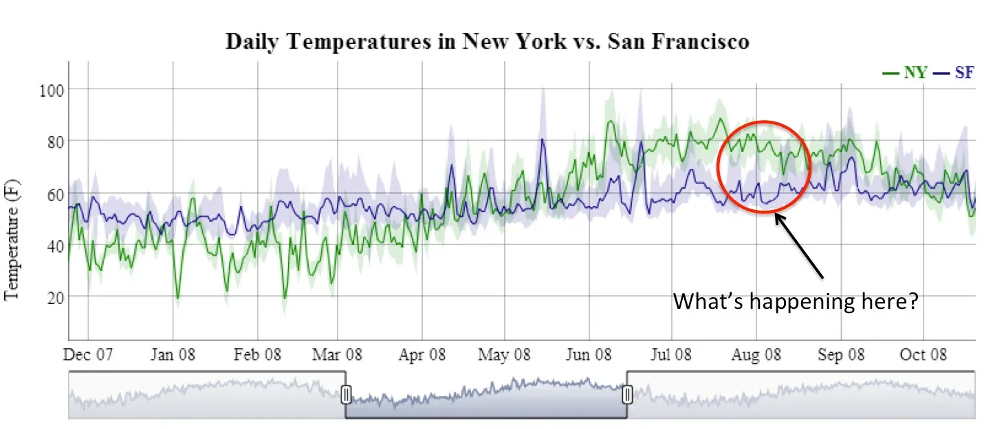 In August 2008, the average temperature in NY was 80 degrees and for San Francisco, it was 60 degrees. This is not trivial, even for a human being. This is a relatively simple chart, here is a little more complex chart: