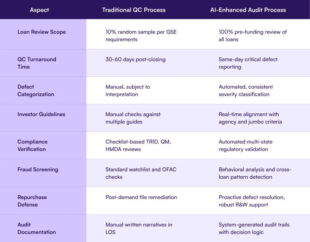 Let's compare traditional audits with AI-powered audits across key aspects of the mortgage auditing process: