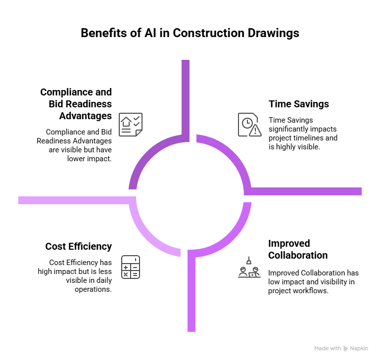 The adoption of AI for Construction Drawings is no longer just about keeping up with technology—it’s about staying competitive. From faster take-offs to more accurate bids, AI helps construction teams save time, cut costs, and eliminate the guesswork that often slows projects down. The following are some of the most visible and impactful benefits of using AI for Construction Drawings across modern project workflows.