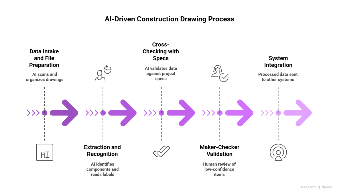 The system validates extracted data against project specs or schedules to spot mismatches early.