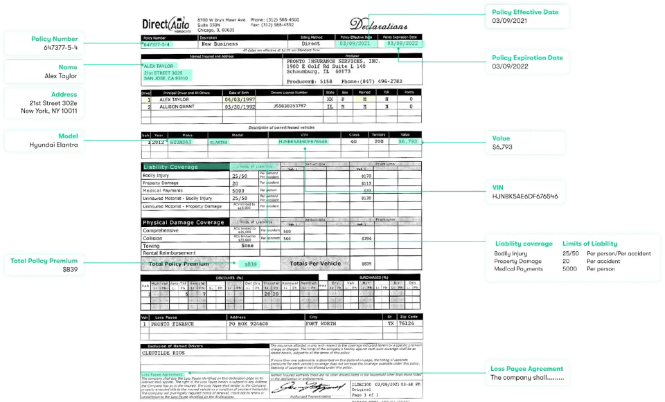 Insurance policy documents present a myriad of challenges that traditional OCR solutions struggle to overcome. For instance, a Policy Declaration document can differ significantly from a Policy Renewal document, making it difficult for legacy OCR systems to accurately distinguish between them. Moreover, layouts vary widely between insurance carriers like Geico, State Farm, or Allstate, further complicating the identification and extraction of pertinent information. Look at this snapshot of an insurance policy document to understand the complexity.