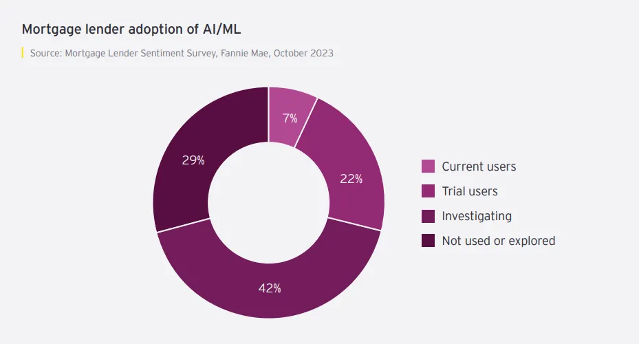According to Fannie Mae’s October 2023 Mortgage Lender Sentiment Survey, only 7% of mortgage lenders are using GenAI, while others are still exploring or have yet to adopt it.