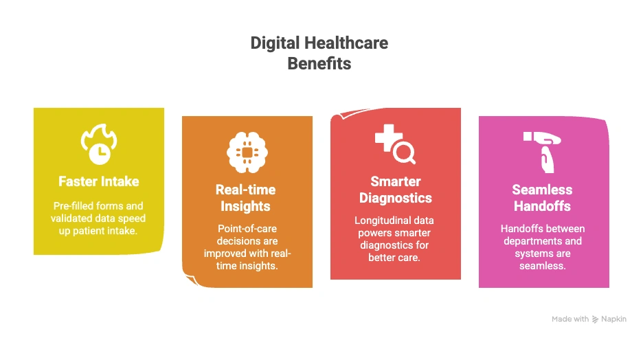 - Faster Operations: Automates manual entry, cuts turnaround time for billing, patient intake, and report generation.