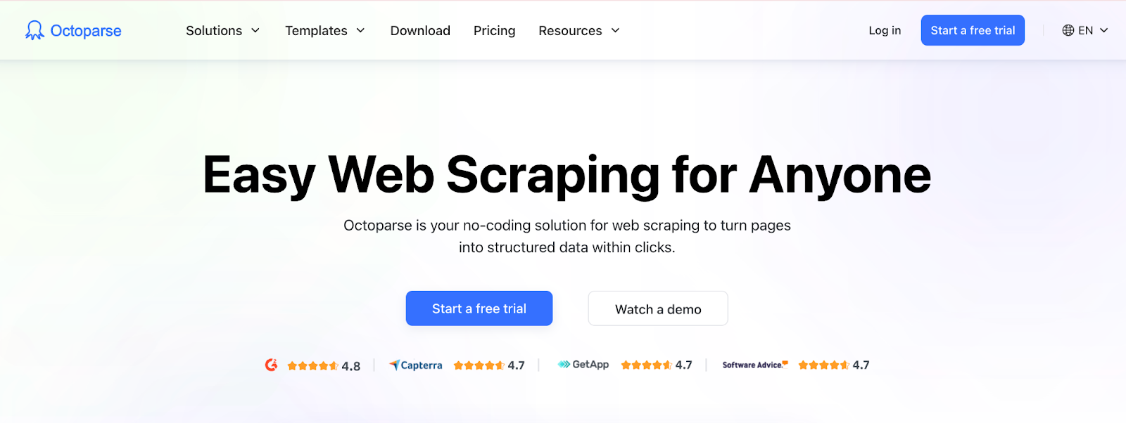 Octoparse is a no-code web scraping tool that earns its place among the best data extraction software for business users who want to collect online data quickly. Its pre-built templates make setup simple.