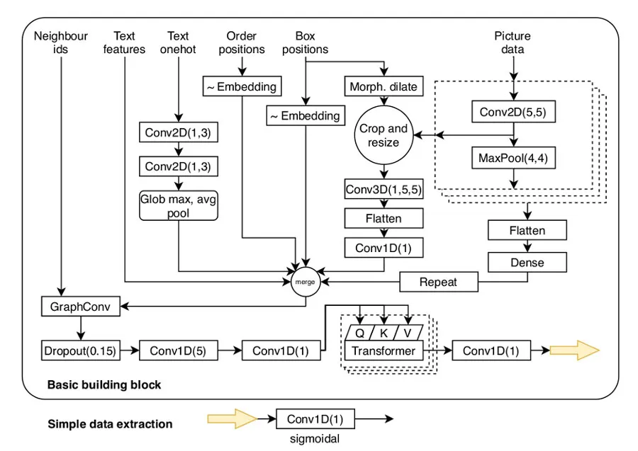 The five inputs namely downsampled picture, feature of all word-boxes, 40 one-hot encoded characters for each word-box, neighbor-ids, position id by geometric ordering are concatenated to generate an embedding vector. The transformer approach is used to the position embedding vector. Image is stacked, max-pooled and morphologically dilated to generate 32 float features. Before attention, dense, or graph convolution layers are used, all the features are simply concatenated.