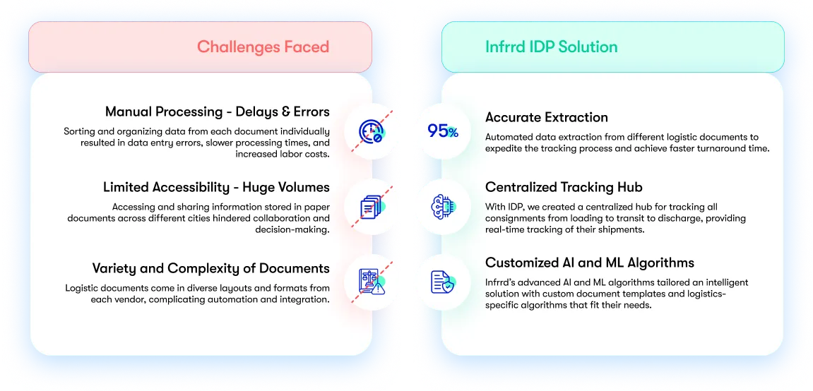 One real-world example of Infrrd IDP implementation in the logistics industry is Covantis, a global platform for trading agricultural commodities. By leveraging Infrrd’s logistics automation system, Covantis has been able to automate document processing, improve efficiency, and enhance transparency in the supply chain. Look at how they transformed their challenges with Infrrd IDP.