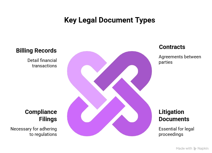 - Billing records: Capturing matter codes, line items, and invoice amounts.