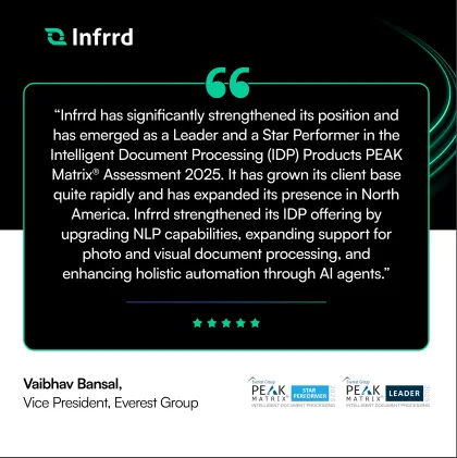 That’s why Infrrd’s Intelligent Document Processing (IDP) platform was recognized as a Leader and Star Performer in Everest Group’s 2025 PEAK Matrix® for IDP. Their evaluation cited Infrrd’s innovation and real-world business impact, particularly in automating complex, high-volume workflows that traditional OCR can’t handle.