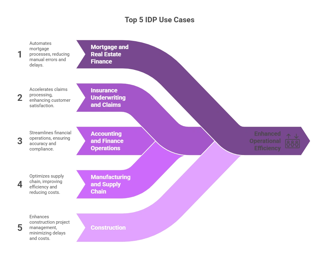 In the rest of the article, you’ll explore how IDP is transforming five key sectors: Mortgage Lending, Insurance, Accounting/Finance, Manufacturing, and Construction. You’ll see real examples, industry data, and the tangible benefits IDP brings: faster cycle times, greater accuracy, improved compliance, and better customer experiences. Ultimately, you’ll gain a clear perspective on how IDP use cases can unlock opportunities for your organization.