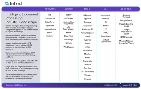 Tip: If your use case involves complex, unstructured, messy documents, then take a good look at these vendors. We at Infrrd believe we’re the leader among these innovators, but don’t take our word for it-- check out our IDP platform and decide for yourself.