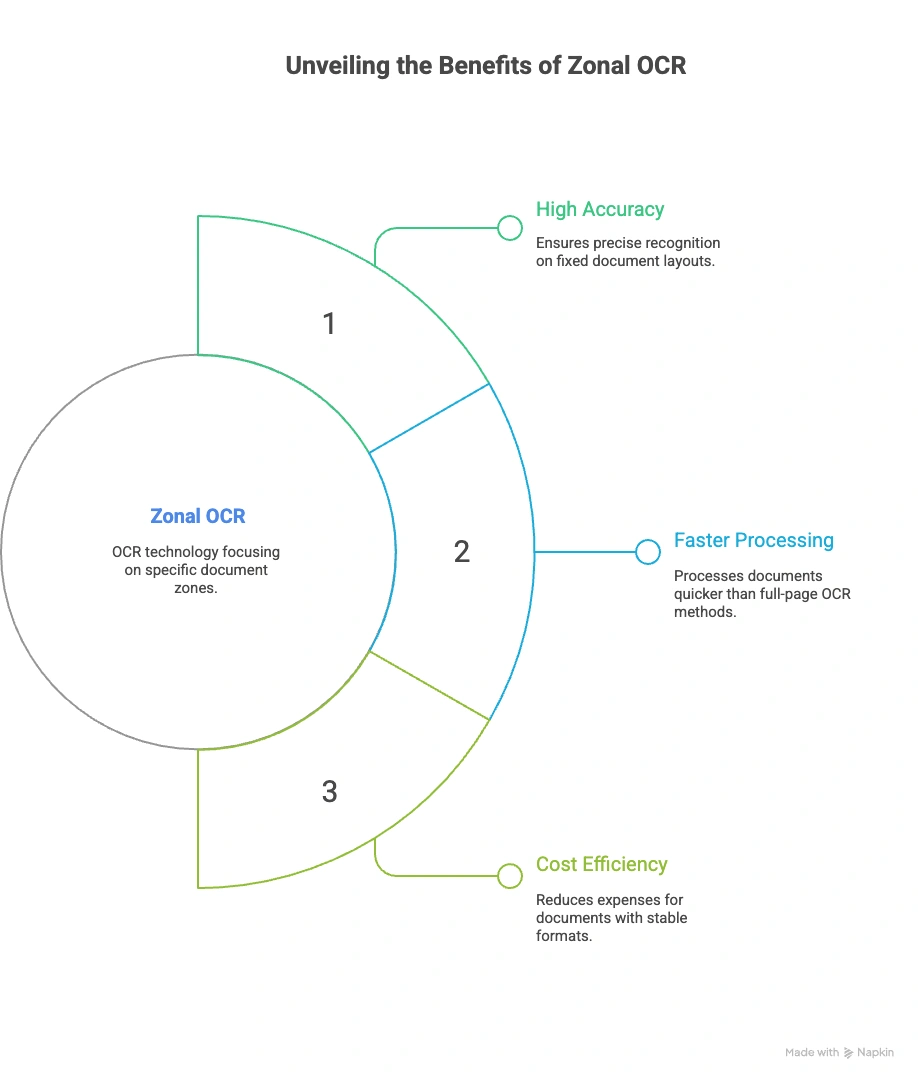 Instead of scanning and analyzing the entire page, Zonal OCR only focuses on specific zones where data is expected. This targeted approach reduces processing time and speeds up data extraction.