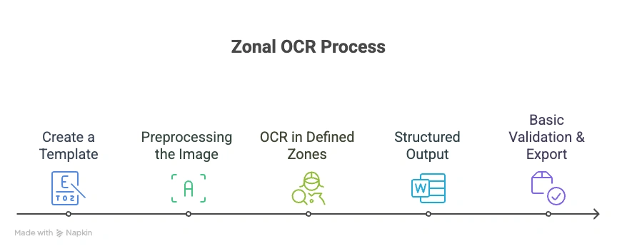 Zonal OCR might sound technical, but its workflow is fairly simple. It revolves around extracting text from predefined areas (or “zones”) on a document. Here’s how the process unfolds: