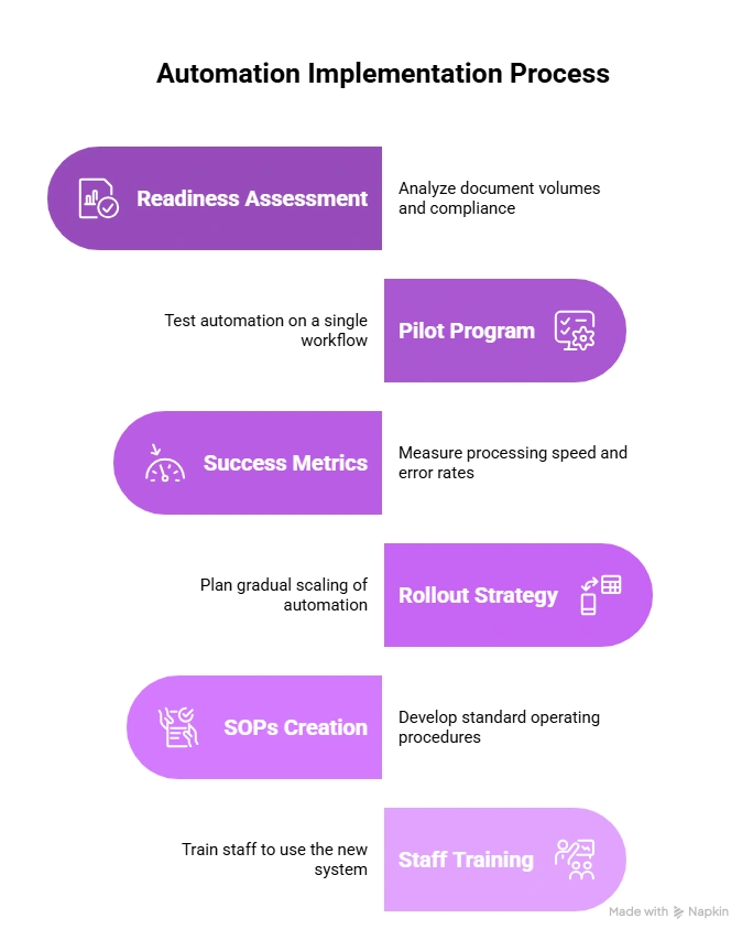 Don’t jump in blindly. Run a pilot on a single workflow, such as invoice processing or claims intake. Measure success with metrics like processing speed, error rates, and cost savings.