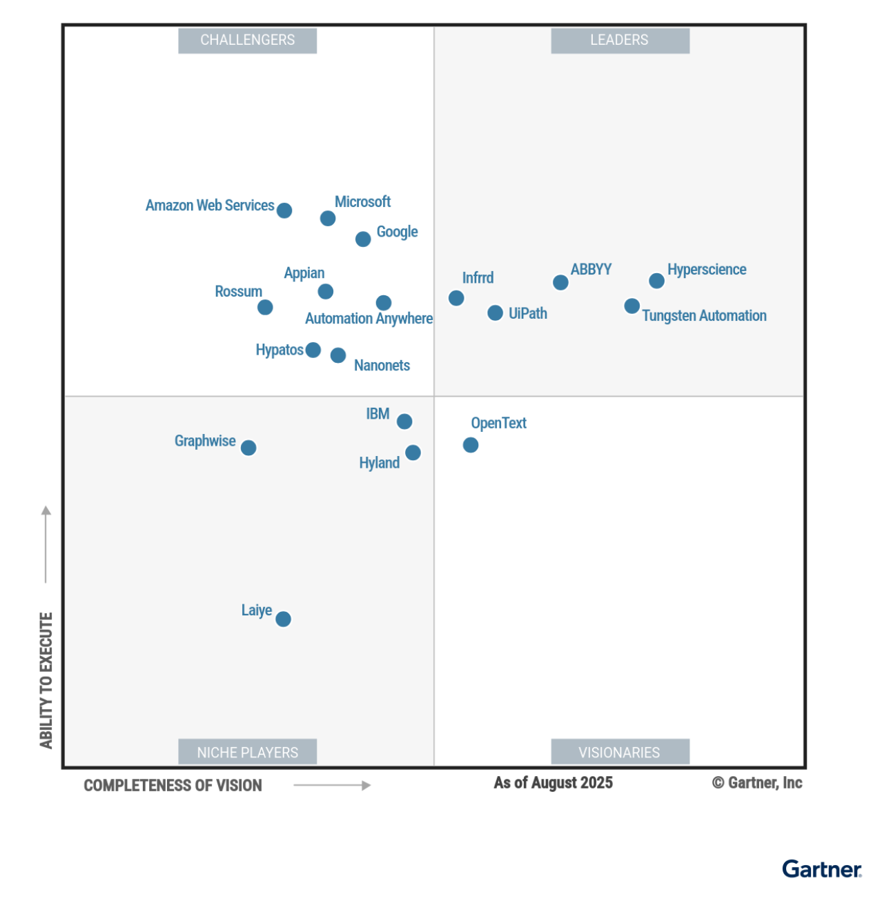 In our opinion, the Gartner Magic Quadrant™ for Intelligent Document Processing Solutions is one of the most trusted industry resources, delivering an in-depth analysis of the global document automation and IDP landscape. Using its established research methodology, Gartner provides a graphical competitive positioning of technology providers across four categories: Leaders, Visionaries, Niche Players, and Challengers.